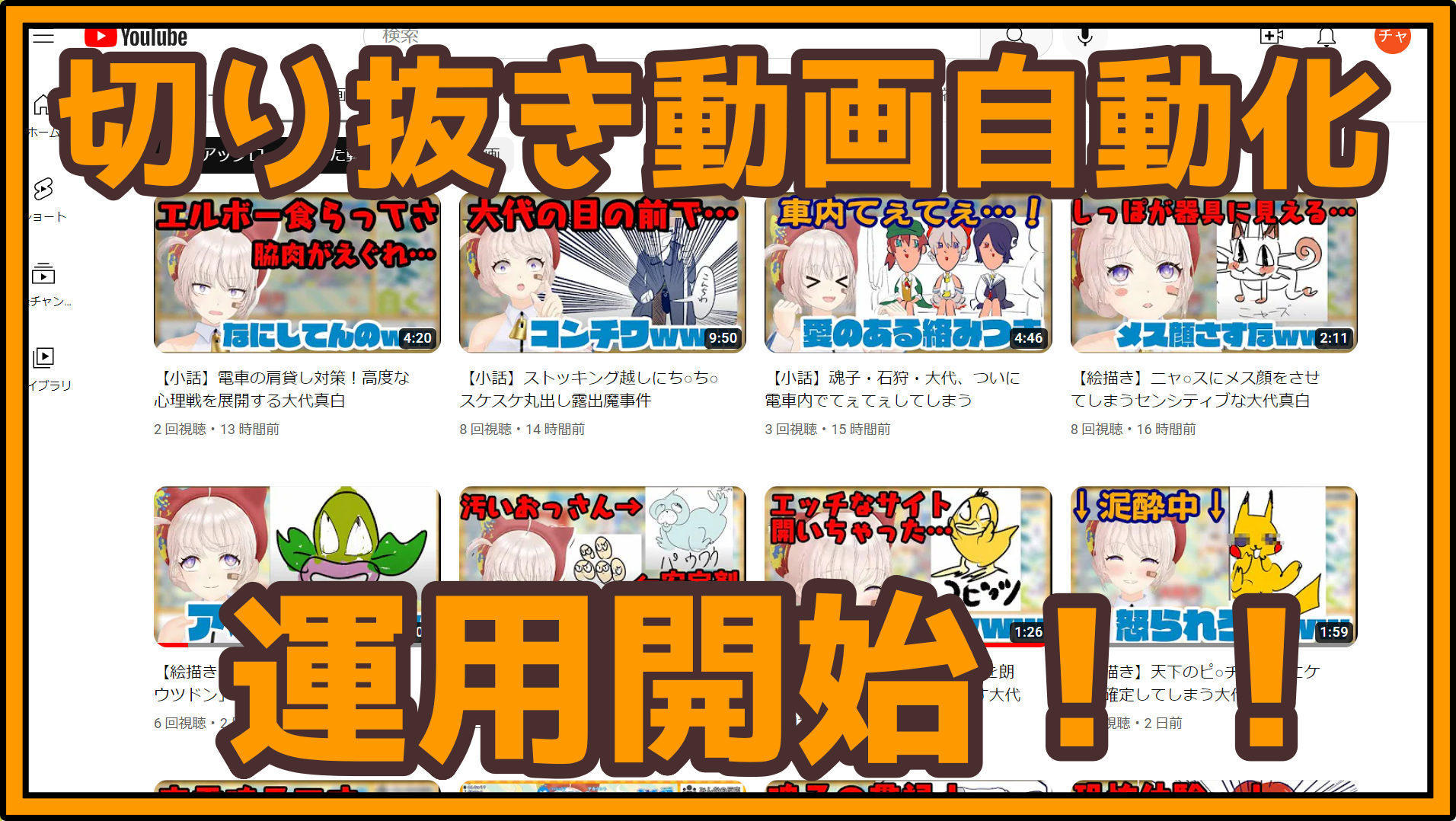 今回のシリーズはyoutubeチャンネルの運営に関する内容を備忘的に書くつもりなので、切り抜き動画の自動生成プログラムの内容に関しては触れる予定はないです。洗練されてノウハウとかも確立したら公開するかもしれません。
